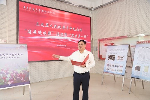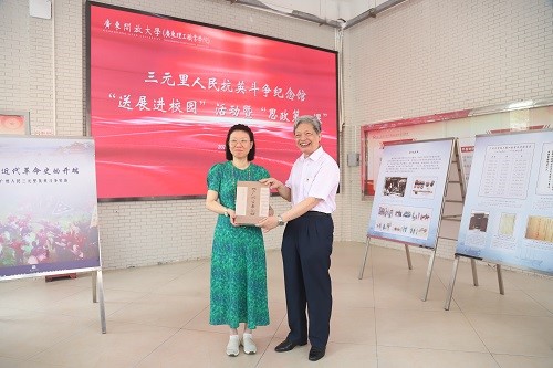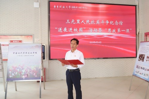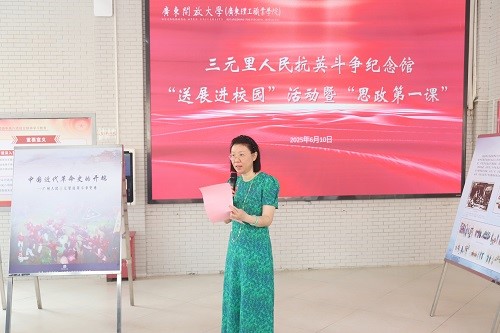 6月10日,三元里人民抗英斗争纪念馆“送展进校园”活动暨“思政第一课”在学校白云山校区举行。学校党委书记幸小涛以《追溯三元里抗英峥嵘岁月,勇担新时代青春奋斗使命》为题授课,结合图文展览,和广大青年学生一起回顾一百多年前三元里人民自发英勇抗击英国侵略者、誓死保卫家园可歌可泣的历史事迹,勉励大家把爱国之心化为报国之行,让青春在为推进强国建设、民族复兴伟业不懈奋斗中绽放出最绚丽的光彩。广州博物馆副馆长朱晓秋、学校党委副书记谢锦群出席活动并致辞。三元里人民抗英斗争纪念馆主任梁慕瑜,学校关工委副主任、原副校长余嘉强出席活动。