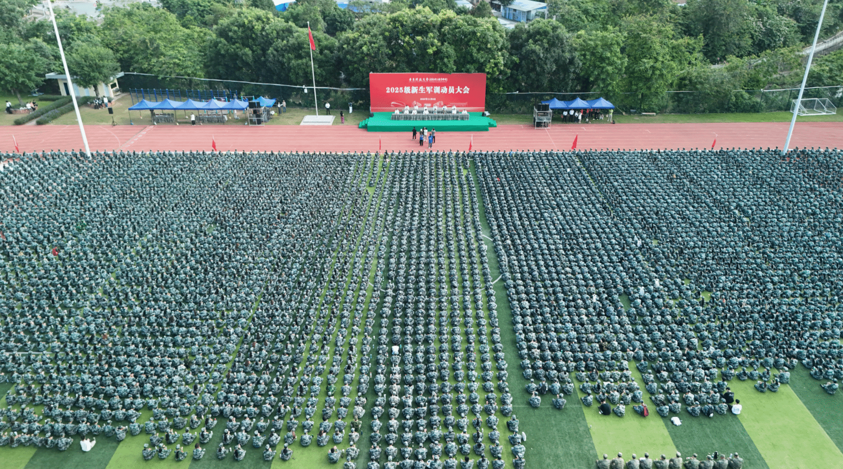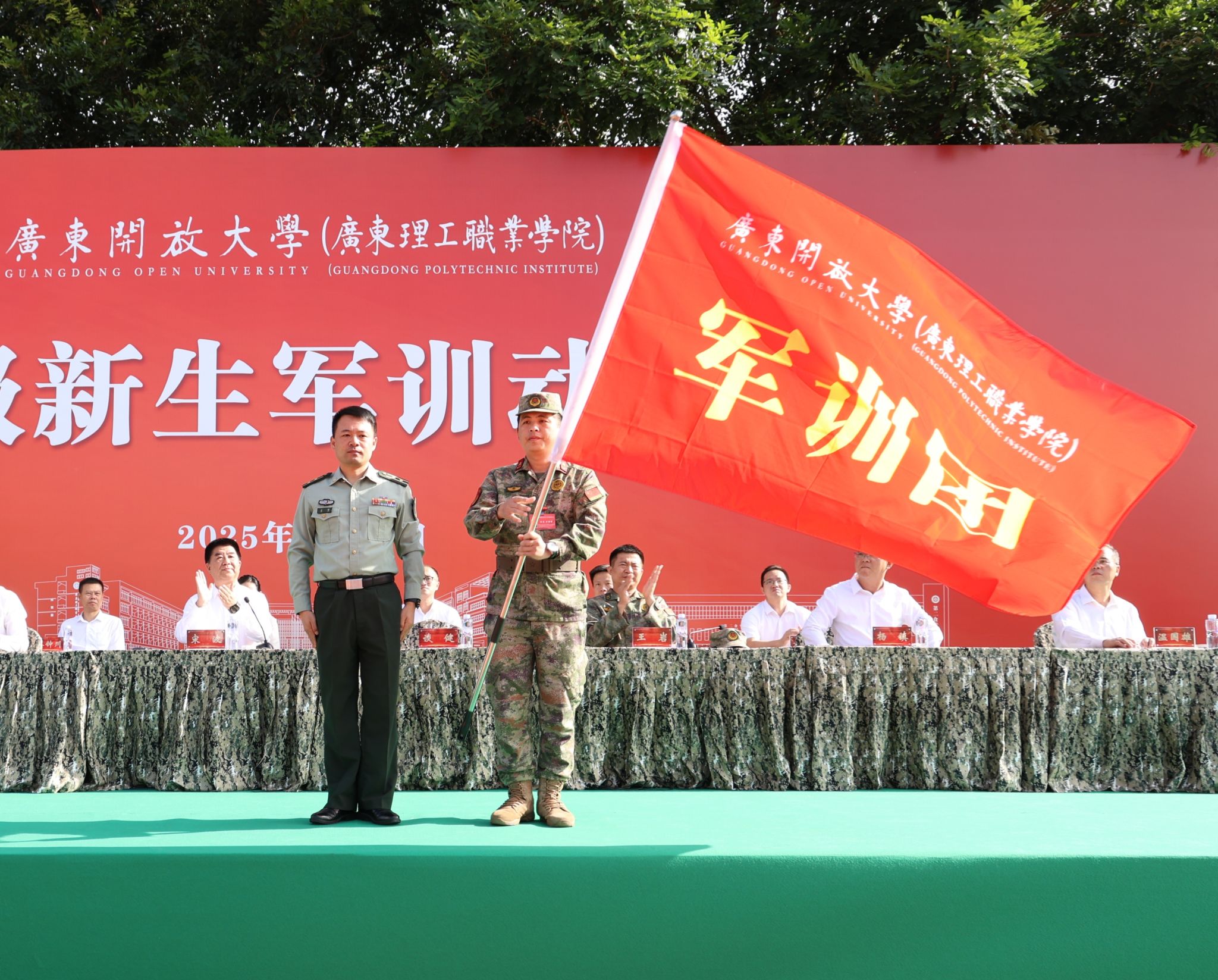 阳光正好,青春集结。11月8日,学校2025级新生军训动员大会在中山校区和白云山校区举行。学校党委委员、副校长宋波作动员讲话,中山军分区战备建设处副处长谈健向军训团团长授军训团旗,中山市直属机关武装部副部长王岩代表承训单位讲话。学校学生工作部、后勤基建部、保卫部(武装部)、团委和各学院党总支负责同志,带新辅导员,全体教官及2025级新生参加大会。