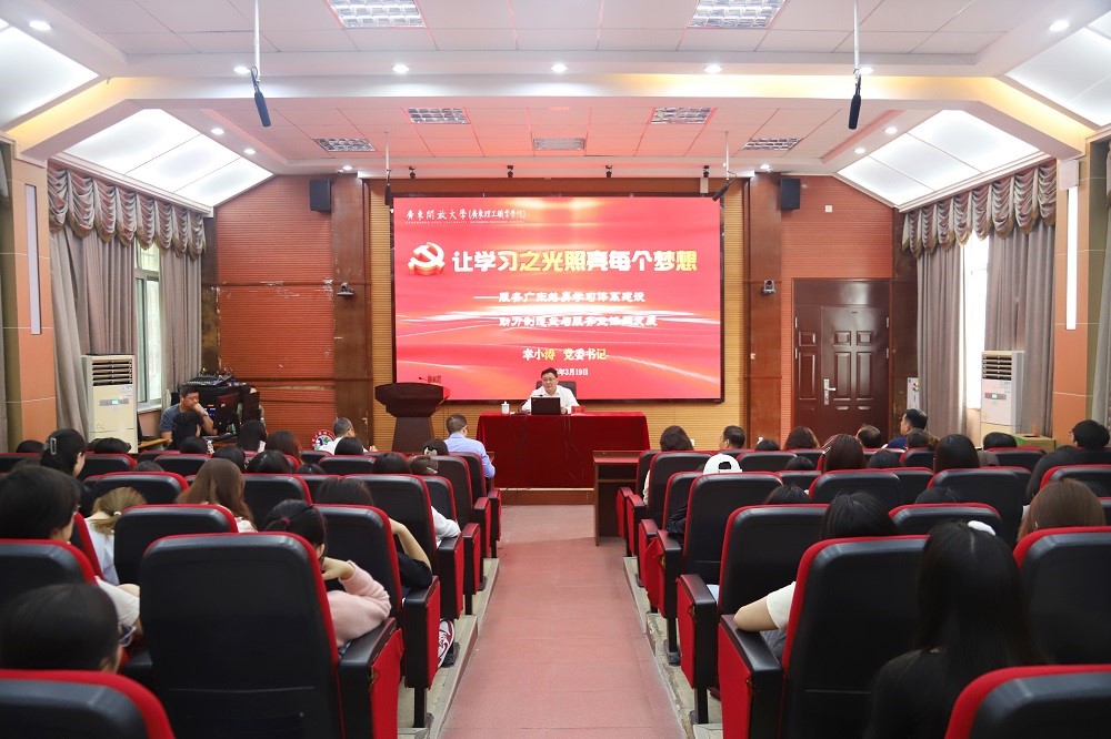 “梦想从学习开始,事业靠本领成就。对于身处产业变革一线的我们而言,习近平总书记这句话有着更为深刻的时代分量。”3月19日下午,学校党委书记幸小涛以“让学习之光照亮每个梦想”为主题,为全省开放大学体系和学校高职全体师生讲授春季学期“思政第一课”,勉励大家将终身学习理念刻进心里、落到实处,用过硬本领服务广东高质量发展。