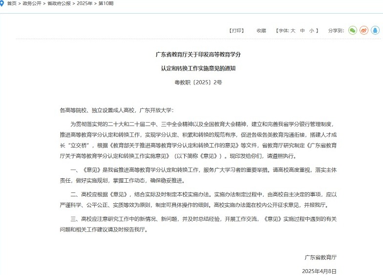 省教育厅印发《广东省教育厅关于高等教育学分认定和转换工作实施意见》