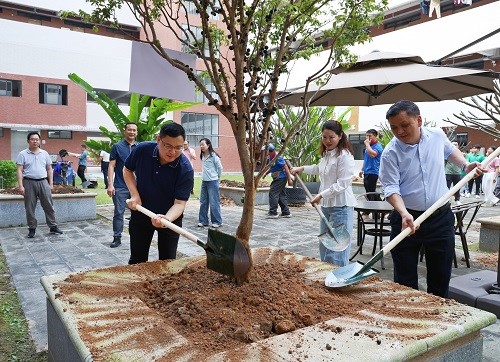 中山校区植树地点选在各学院一站式学生社区和教师公寓旁,白云山校区则位于教学楼和体育馆旁。植树现场,幸小涛和刘文清身体力行,与师生们一同挥锹铲土、扶苗填坑、提水浇灌。大家分工协作、默契配合,现场气氛热烈而温馨,一株株新苗在春风中昂然挺立。