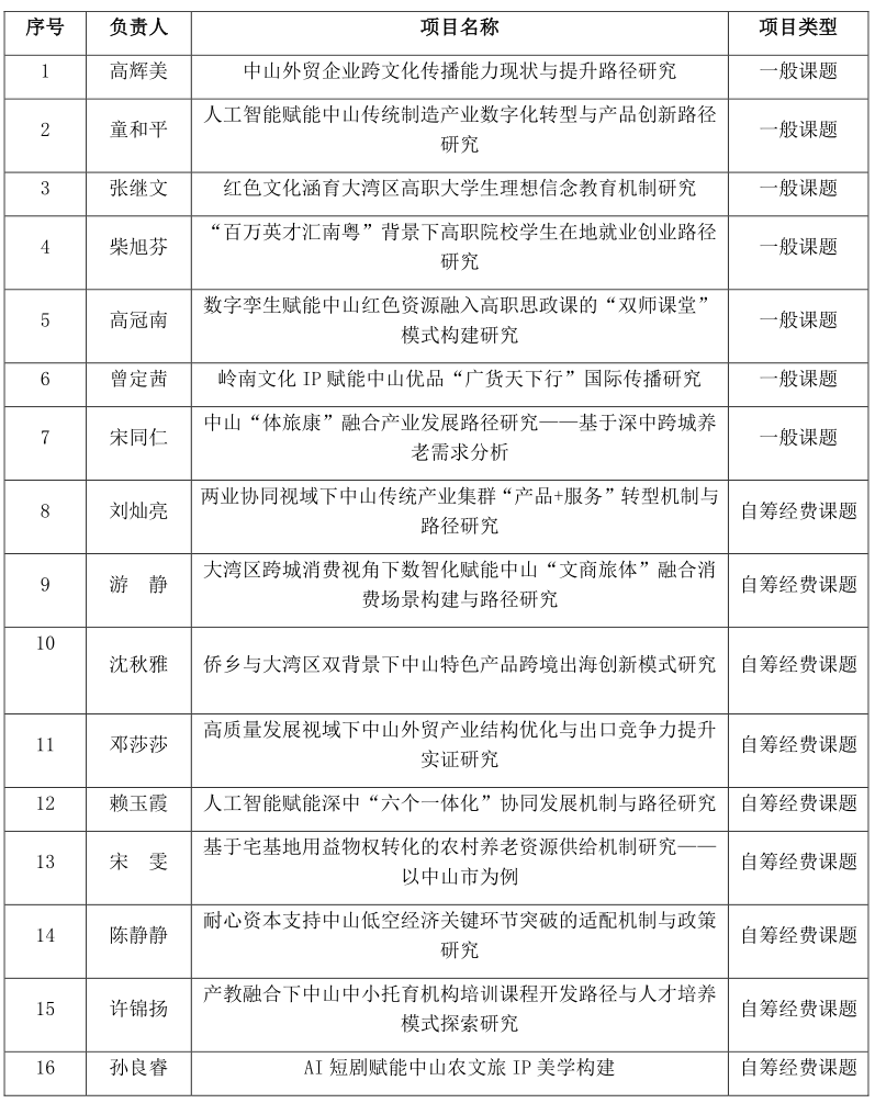 4月16日,中山人文社科网发布《关于2026年度中山市社科规划课题立项的通知》,全市共123项申报课题获准立项。其中,学校共有16个项目获得立项,包括一般课题7项、自筹经费课题9项。