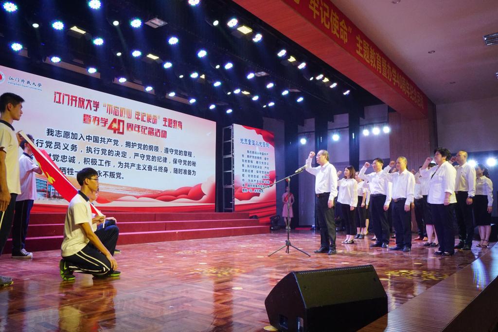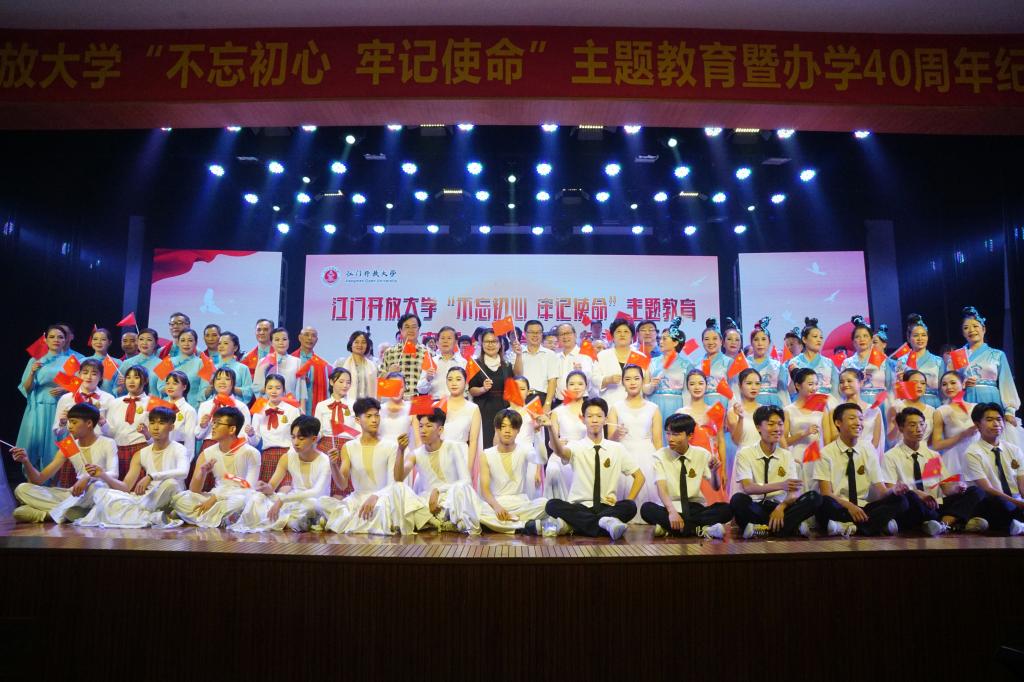 10月30日下午, 江门开放大学举办“不忘初心、牢记使命”主题教育暨办学40周年纪念活动。市委主题教育第九指导组组长陈伟平,广东开放大学终身教育学院院长梁瑞明,广东开放大学规划与体系建设处处长李光先,江门市教育局机关党委专职副书记吴思锋,江门开放大学党委书记吴军,党委副书记、校长任忠红,副校长钟筱春,党委副书记、纪委书记卓国强,党委委员、副校长张鼎立,老教职工代表、师生代表近400人欢聚一堂,载歌载舞,同庆江门开放大学40年的发展成长。