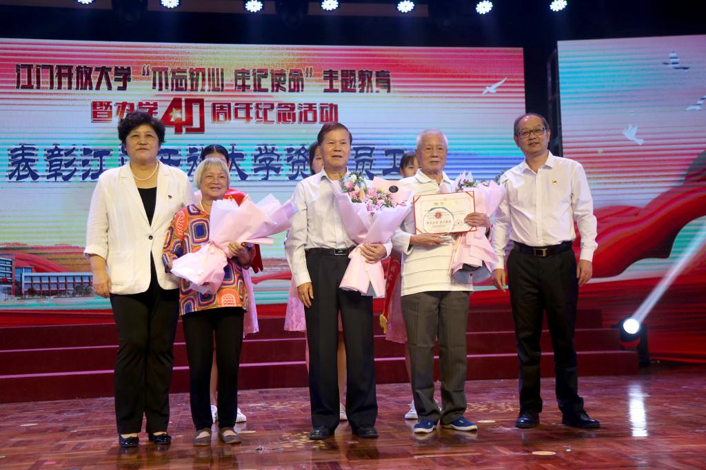 任忠红宣读了《关于表彰江门开放大学资深员工的决定》,表彰5位为学校事业发展服务满40年的老同志。吴军、任忠红为老同志送上荣誉证书、纪念品和鲜花,感谢他们多年来付出的辛勤汗水,希望他们能一如既往地关心和支持学校的发展。