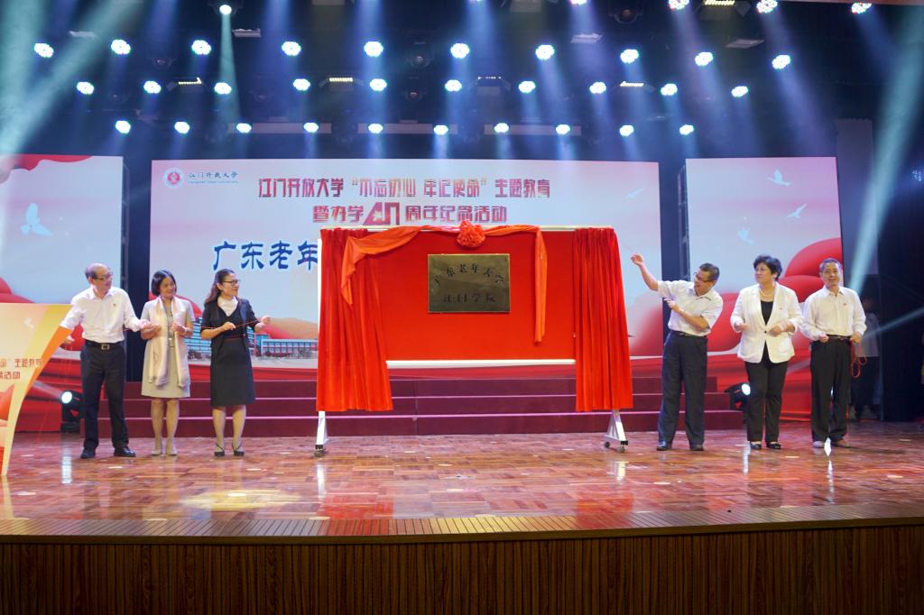 活动在舞蹈《新生》中拉开帷幕。梁瑞明宣读《广东开放大学关于同意江门开放大学加挂广东老年大学江门学院牌子的复函》。陈伟平、梁瑞明、李光先、吴思锋、吴军、任忠红共同为广东老年大学江门学院揭牌。
