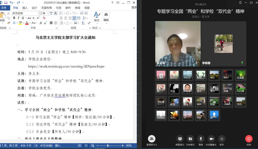 5月31日晚,马克思主义学院党支部全体党员、广开思政课核心团队成员共31人通过企业微信召开学习扩大会议,畅谈对全国两会精神和学校双代会精神的学习心得体会。本次会议由马克思主义学院党支部书记、院长李义丰教授主持。