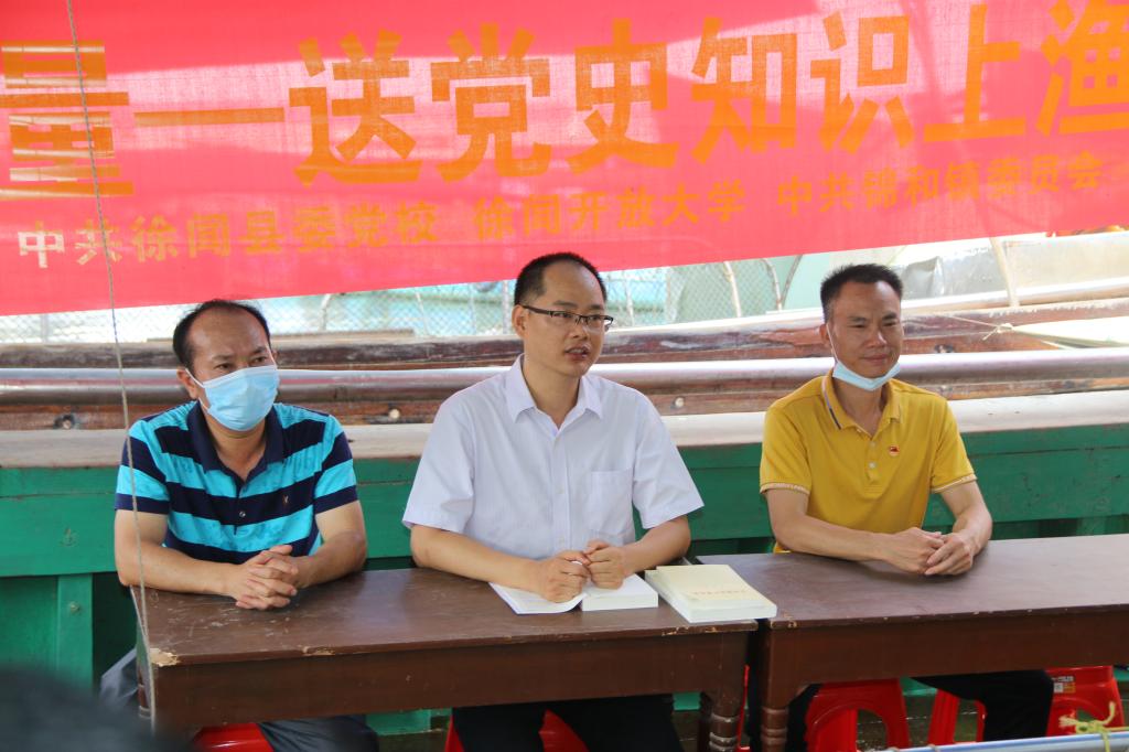为进一步推动党史学习教育走深走实,切实开展“我为群众办实事”,趁着休渔期,渔民返港休整之际,5月14日,徐闻开放大学和锦和镇党委在外罗渔港开展“送党史知识上渔船”活动,由徐闻县委宣讲团讲师黄海波为当地渔民上了一堂生动的党史教育课。