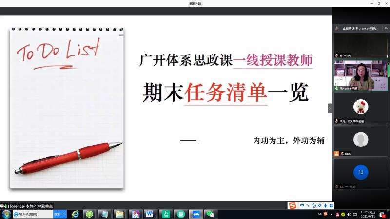 6月11日下午,广东开放大学体系思政课教学团队通过云端召开研讨会,集中开展党史学习教育,推进党史融入校园融入思政课,部署2021年春学期期末教学考试工作。各市、县开放大学、省直分校思政课教师70多人参会,会议由马克思主义学院李晓春老师主持。