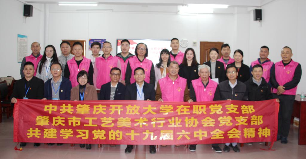 12月3日上午,肇庆开放大学在职党支部与肇庆市工艺美术行业协会党支部开展结对共建,进一步学习贯彻党的十九届六中全会精神座谈会,构建“资源共享、优势互补、互相促进、共同提高”的党建工作新格局。 学校党总支书记、校长罗红金,副校长张青青、黎志强,肇庆市工艺美术行业协会专职副会长兼秘书长郑天旭、党支部书记杨智麟、监事长黄超洪出席。学校在职党支部书记全永松主持,双方党支部党员代表参加。