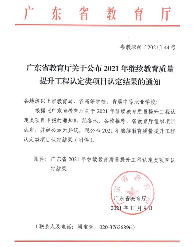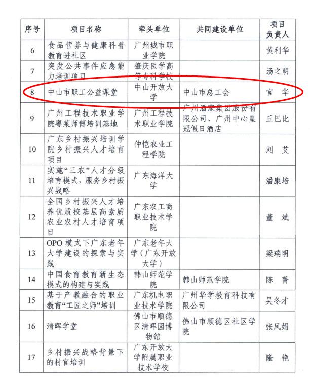 日前,广东省教育厅公布了广东省2021年继续教育质量提升工程认定类项目的认定结果,中山开放大学“中山市职工公益课堂”项目喜获广东省终身教育品牌项目称号。