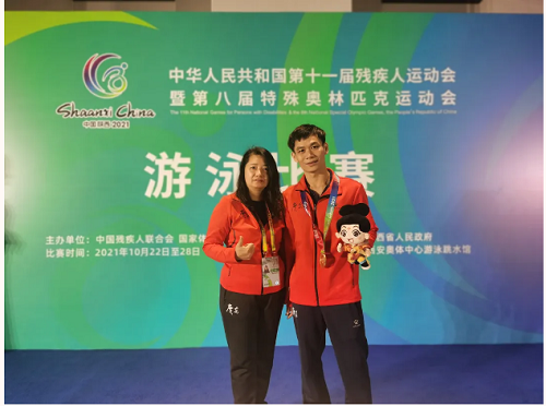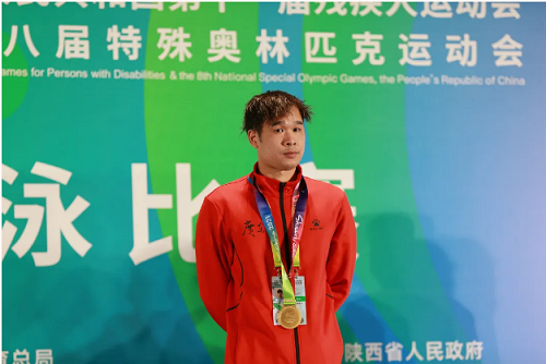 林福荣、崔永佳同学在游泳比赛中顽强拼搏。林福荣斩获男子S10级50米自由泳、男子S10级100米蝶泳两项冠军;男子SB9级100米蛙泳、男子S10级100米自由泳两项亚军;男子SM10级200米混合泳、男子34分4×100米混合泳接力两项季军及男子34分4×100自由泳接力第四名。