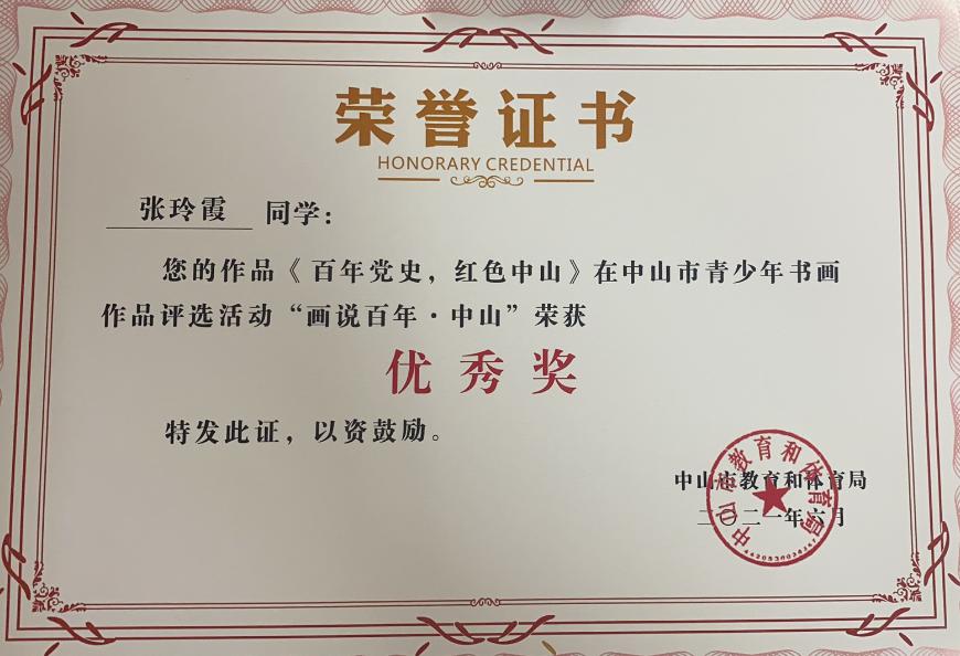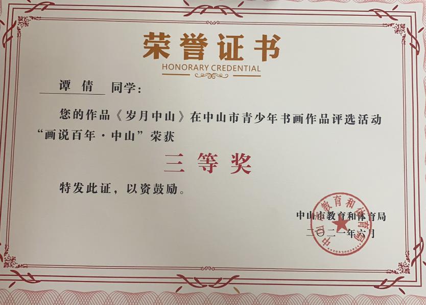 近日,在中山市青少年书画作品评选活动中,中山开放大学学生谭倩的参赛作品《百年中山》荣获三等奖,张玲霞的参赛作品《百年党史,红色中山》荣获优秀奖。