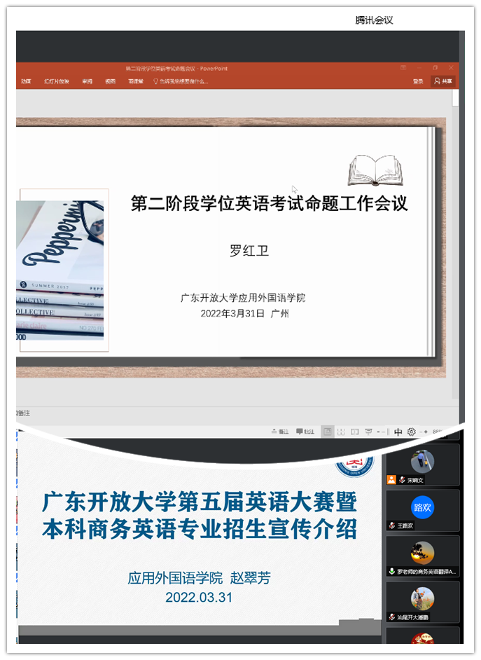 3月31日下午,应用外国语学院通过腾讯会议组织召开广东开放大学(以下简称广开)学位英语考试题库建设及考务工作在线会议。广开英语专业教学团队成员参加会议,会议由应用外国语学院院长彭伟强主持。