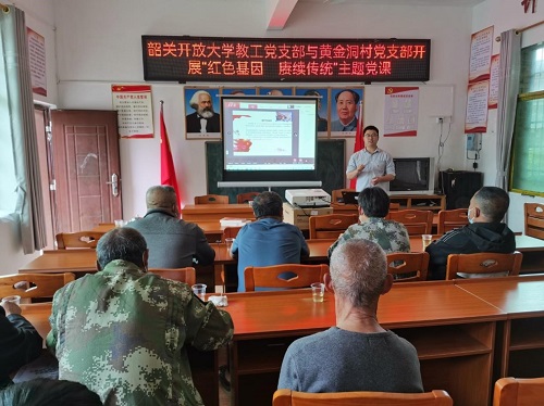 随后,韶关开放大学驻秀水镇帮镇扶村工作队员聂翰林讲了《红色基因 赓续传承—中国共产党百年历程梳理》的主题党课,他以党史中的重大事件为线索,从新民主主义革命时期、社会主义革命和建设时期、改革开放和现代化建设时期、中国特色社会主义新时代等四个历史阶段对党史进行了系统讲解,深刻阐释了开展党史学习教育的重大意义,全面总结了中国共产党百年奋斗的光辉历程和历史性贡献。韶关开放大学教工党支部及黄金洞村党支部其他党员通过线上直播方式进行了观看学习。