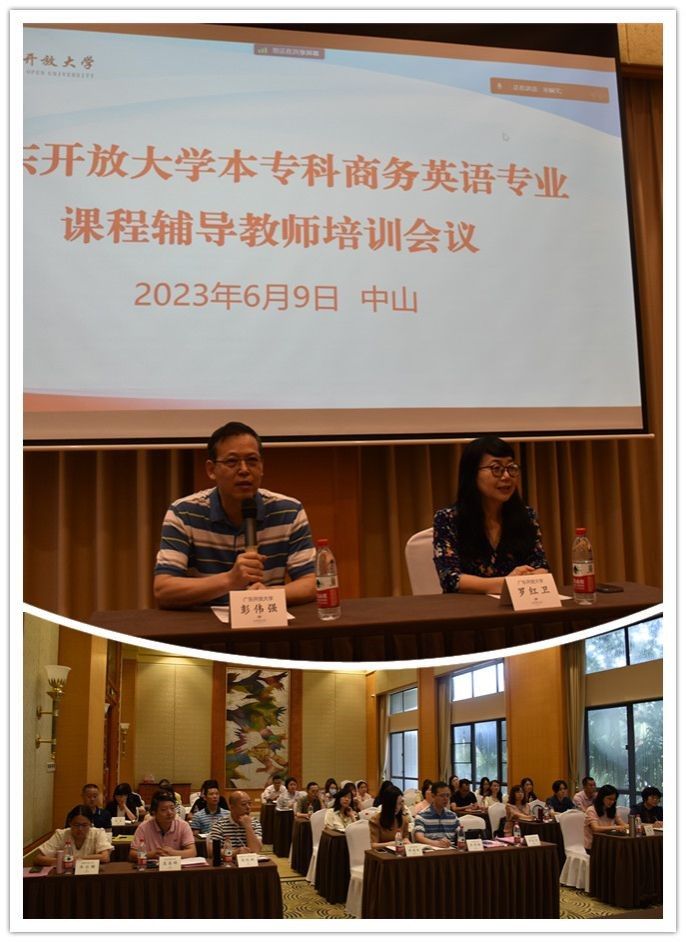 6月9日,广东开放大学本专科商务英语专业课程辅导教师培训会在中山举行。市县级开放大学英语教学负责人,广开英语专业负责课程辅导教师、专业导修教师以及教务人员等60余人通过线上线下参加会议,广东开放大学应用外国语学院院长彭伟强、副院长罗红卫出席会议。