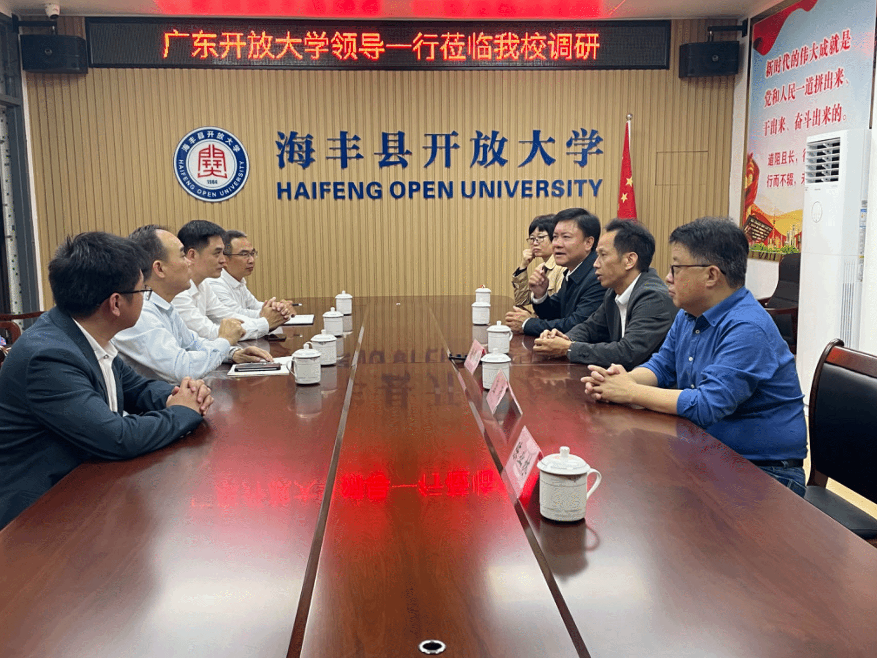 谢锦群深入校园走访,实地察看教学设施、软硬件配套以及学校周边环境,详细了解学校功能布局、办学规模、师资配备情况,并进行座谈交流,认真听取两校办学情况汇报。谢锦群对汕尾开大和海丰县开大近年来改革发展取得的显著成效给予充分肯定,高度赞扬两校领导班子和广大教职工在办学中所展现出的艰苦奋斗、克难攻坚、锐意进取的开大精神。