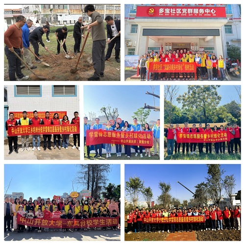 中山开放大学积极响应绿美广东生态建设和市委关于推进“百千万工程”人居环境建设和绿化美化工作部署,于3月上旬组织开展“绿美中山党旗扬”植树活动。校党委书记陈健雄、校长官华带领班子成员、全体教职工和校友代表参加了活动。黄圃、三角、沙溪、小榄等分校(教学点)分别与周边的社区、村委等单位联合开展了乡村绿化植树活动。