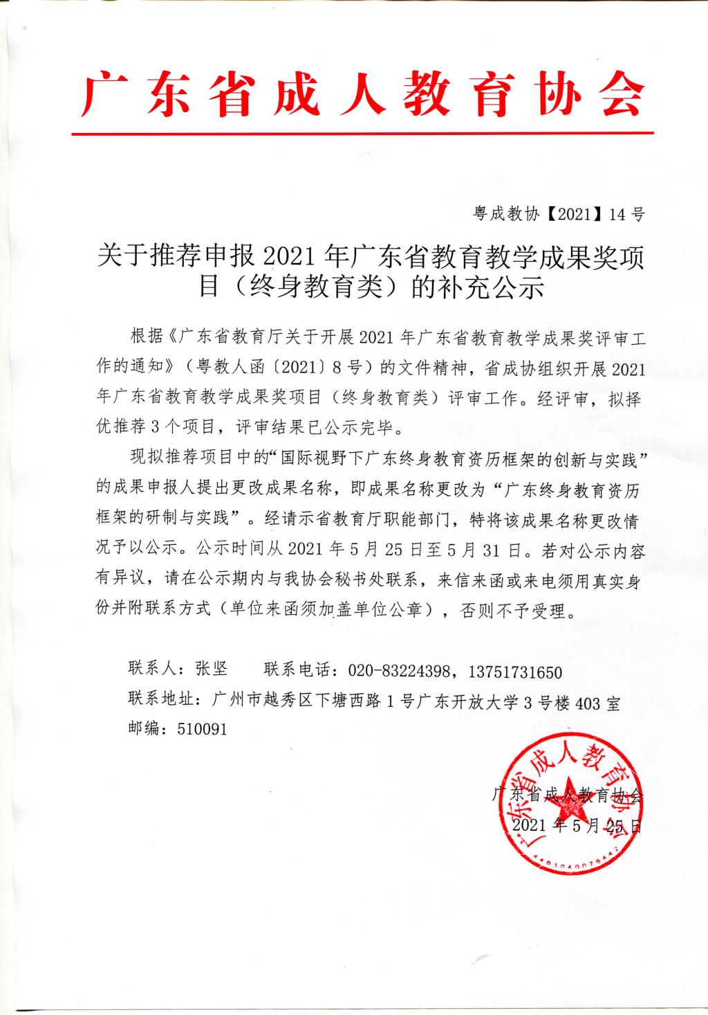 关于推荐申报2021年广东省教育教学成果奖项目(终身教育类)的补充公示
